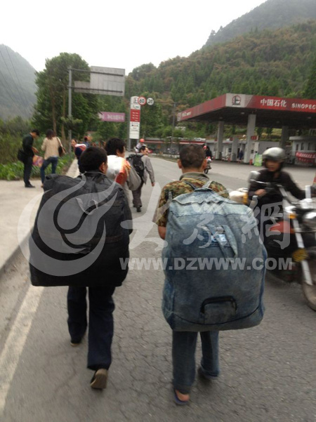 21日早,雅安地震第二天,在通往重震區的道路上,隨處可見背負沉重行囊的返鄉人。他們迫切地趕往被地震損毀最嚴重的蘆山縣和寶興縣,因為那里有他們的家人。