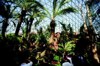 走進植物館沙生植物區,仿照熱帶荒漠景觀營造的沙礫地貌上,矗立著高大挺拔的仙人柱、渾圓帶刺的仙人球、排排如扇的仙人掌。穿過這個區域,高大的加拿利海棗及中東海棗組群呈現于眼前,下方是由朱蕉、雪花木、孔雀木及蕨類等植物組成的灌木群。游客步入其間,就好像置身熱帶雨林,異域風情撲面而來。