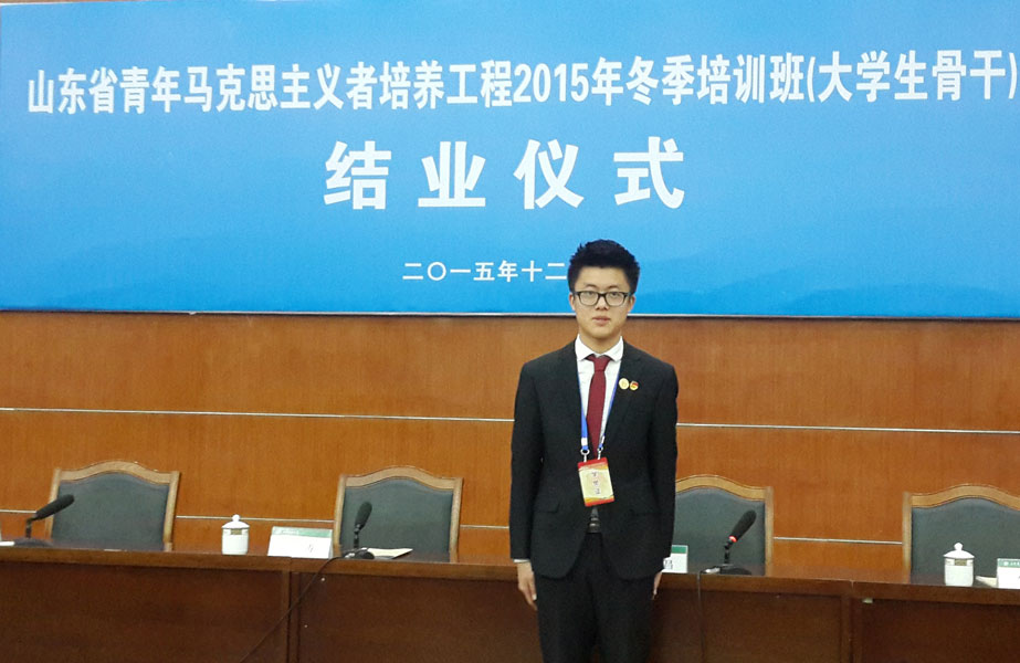 個人簡介:校學生社團聯合會副主席、團委新媒體工作室總編。本人認真學習貫徹黨的十八大和十八屆三中、四中、五中全會精神和習近平總書記系列重要講話精神,積極踐行和培育社會主義核心價值觀,在學習黨的路線、方針、政策方面發揮了模范帶頭作用。先后榮獲“山東省優秀共青團員”、“濰坊學院優秀學生干部”等,榮獲濰坊學院一等獎學金。2015年12月,該生代表濰坊學院參加了由共青團山東省委、山東省學生聯合會聯合舉辦的山東省青年馬克思主義者培養工程2015年冬季培訓班。發表文章:1.2015年大學生“調研山東”社會調查活動《“四個全面”戰略布局公眾認知度的調研》2.中共山東省委高校工委首屆全省高校網絡宣傳思想教育優秀作品評選《濰坊學院“青春濰院”微信公眾平臺思想教育探索》。