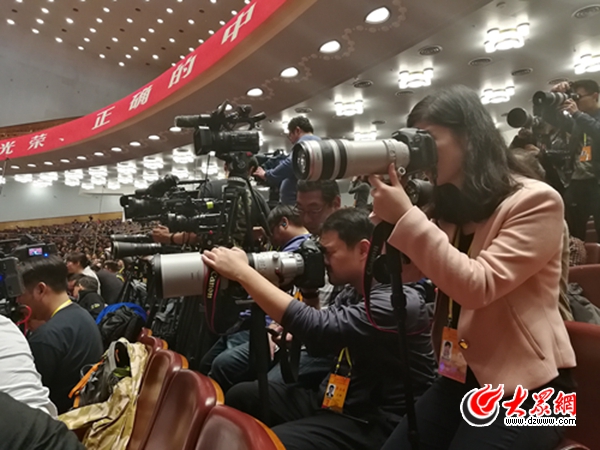 18日上午,北京人民大會(huì)堂二樓,記者們的“長槍短炮”。