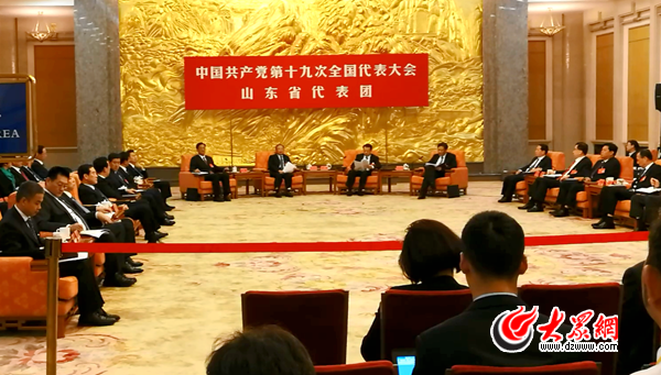 19日下午,在人民大會堂山東廳,出席黨的十九大的山東省代表團在這里舉行聯組會議,討論十九大報告,并向媒體開放。