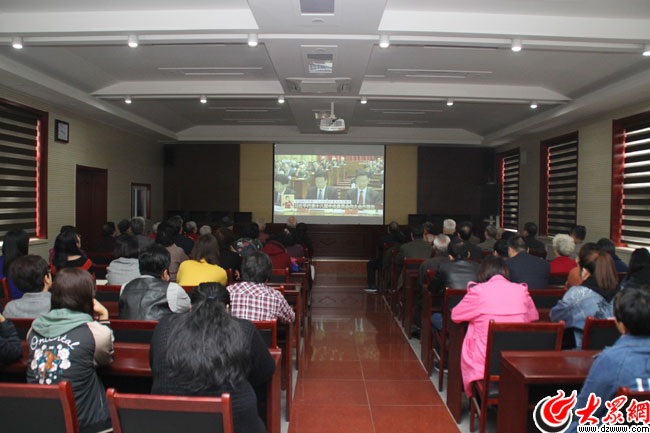 濟南市天橋區(qū)南村街道辦事處會議室內(nèi),居民們收看十九大開幕會