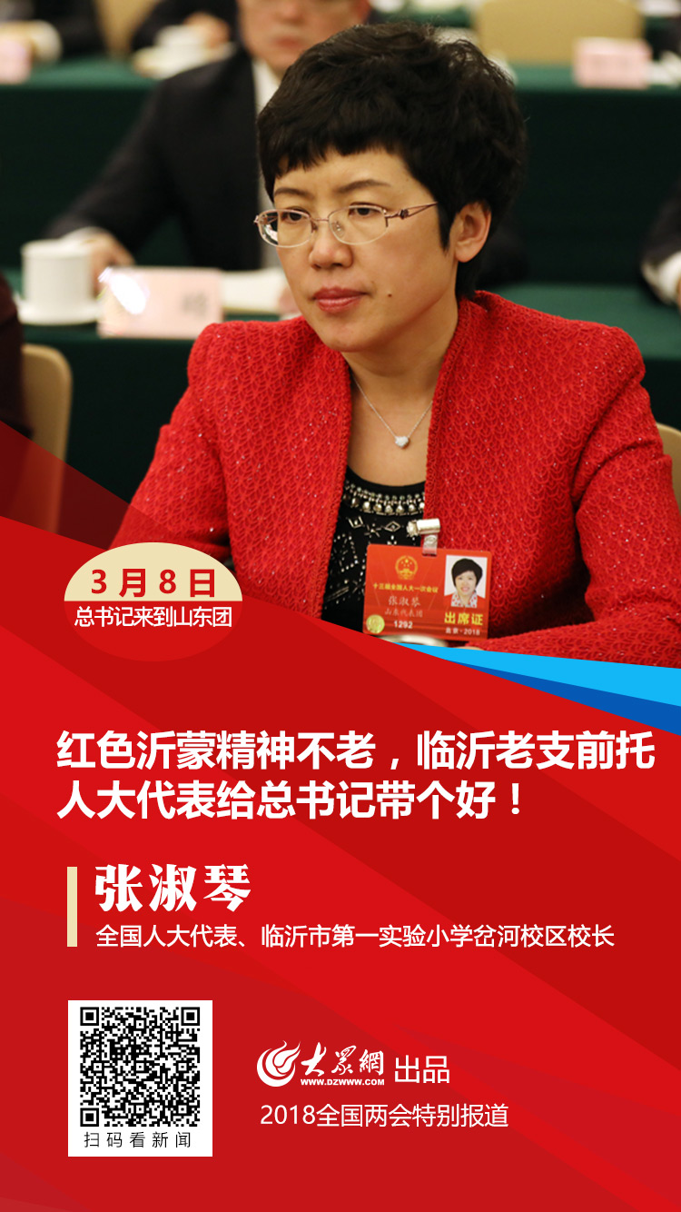大眾網(wǎng)北京3月8日訊(特派記者 孫杰 張建)3月8日上午,中共中央總書(shū)記、國(guó)家主席、中央軍委主席習(xí)近平來(lái)到十三屆全國(guó)人大一次會(huì)議山東代表團(tuán)參加審議。全國(guó)人大代表、臨沂市第一實(shí)驗(yàn)小學(xué)岔河校區(qū)校長(zhǎng)張淑琴在發(fā)言中主要介紹了臨沂市近年來(lái)在沂蒙精神傳承上的做法,還將臨沂老支前王克昌老人的祝福帶給了總書(shū)記。