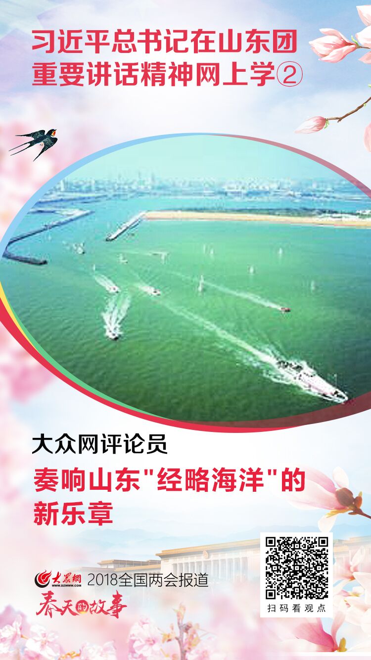 3月8日,習近平總書記參加十三屆全國人大一次會議山東代表團審議并發表重要講話。山東代表團代表深受鼓舞、倍感振奮。在小組討論時,做好經略海洋大文章,建設海洋強省,成為代表們熱議的一個話題。(3月10日大眾網)
