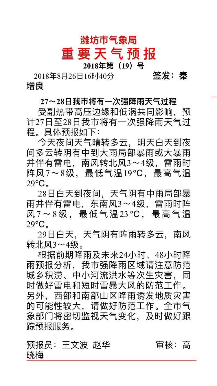 大眾網8月26日訊(記者 張坤)受副熱帶高壓邊緣和低渦共同影響,預計27日至28日濰坊市將有一次強降雨天氣過程。具體預報如下: