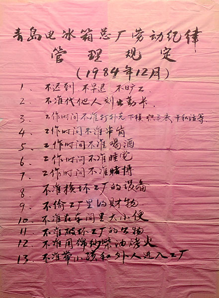 工廠連續虧損,工人拿不到工資,廠內烏煙瘴氣臭味沖天。為了整治工廠,張瑞敏上任后就制定了13條管理規定。其中,赫赫有名的“不準在車間隨地大小便”在當下看來實屬荒謬,卻呈現出了彼時青島電冰箱總廠的真正模樣。規定貼出后,仍有人肆無忌憚地偷原料,張瑞敏當即將此人開除。在制度的嚴格執行下,廠區發生了翻天覆地的變化。
