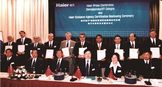 1997年,張瑞敏在德國科隆博覽會上為德國經銷商授權。