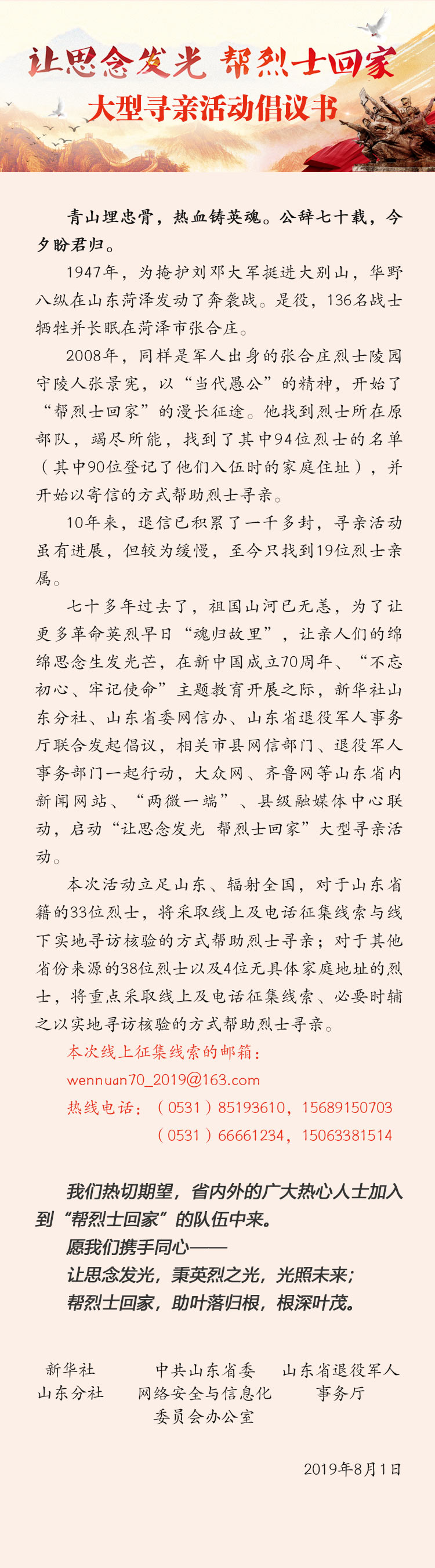 大眾網·海報新聞菏澤8月1日訊(記者 陳洋洋) 8月1日,新華社山東分社、山東省委網信辦、山東省退役軍人事務廳聯合發起倡議,相關市縣網信部門、退役軍人事務部門一起行動,大眾網、齊魯網等山東省內新聞網站、“兩微一端”、縣級融媒體中心聯動,啟動了“讓思念發光 幫烈士回家”大型尋親活動。倡議書發出首日,“烈士尋親”熱線被打爆,熱線電話來自山東省內10余個城市,還包括安徽、河北等全國各地的熱心網友。