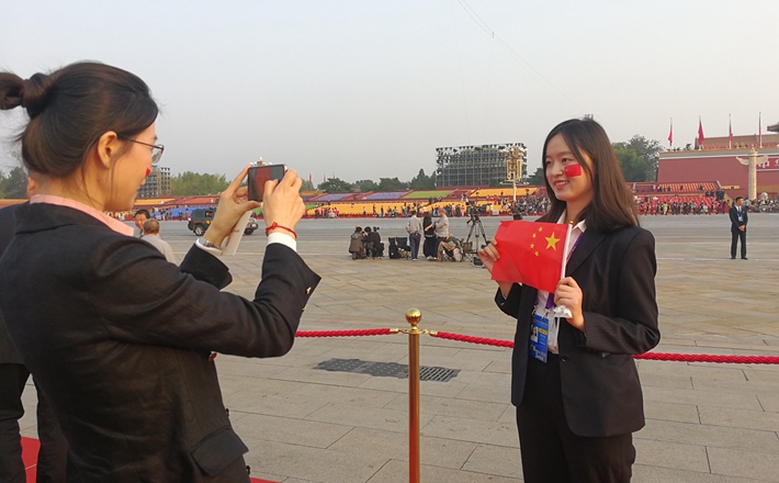 大眾網(wǎng)·海報(bào)新聞北京10月1日訊(特派記者 王磊)今天上午,慶祝新中國(guó)成立70周年大會(huì)、閱兵式和群眾游行,將在北京舉行。在天安門(mén)廣場(chǎng)的觀禮臺(tái)前,前來(lái)觀禮的觀眾們紛紛與國(guó)旗合影。
