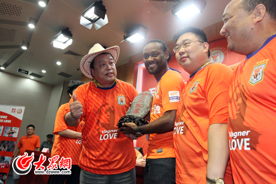 今天下午,魯能泰山俱樂部為來自巴西的魯能新外援瓦格納·勒夫舉行了媒體見面會。勒夫在見面會上展示了他的40號球衣,隨后回答了記者的提問,并接受了大眾網網友和球迷贈送的禮物。