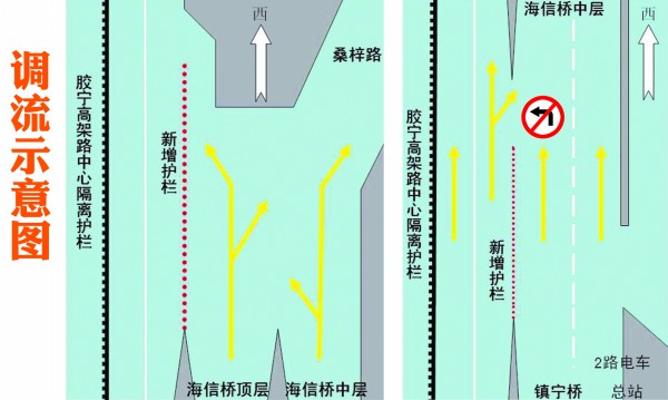 [提要] 膠寧高架路將迎來新一次試驗(yàn)性調(diào)流。據(jù)民警介紹,調(diào)流預(yù)計(jì)將在本周進(jìn)行,由于涉及變道口改變,途經(jīng)膠寧高架路的車輛需要提前變道進(jìn)入所需方向行駛。鎮(zhèn)寧立交橋段只出不進(jìn) 鎮(zhèn)寧立交橋區(qū)域此次將管制的是鎮(zhèn)寧立交橋與海信立交橋之間東向西方向的老堵點(diǎn)。
