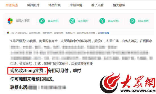 近期正在找房子的侯女士沒少中招。侯女士告訴記者,最近她想著在齊魯軟件園附近找個合租房子,因為不是特別著急要住進去,所以想著先在網上找找個人發布的房源信息。經過幾天的查找,侯女士發現,有些房源信息的標題里明明寫著不是中介,打開之后卻是清清楚楚地寫著經紀人。侯女士說,這分明就是掛著羊頭賣狗肉。