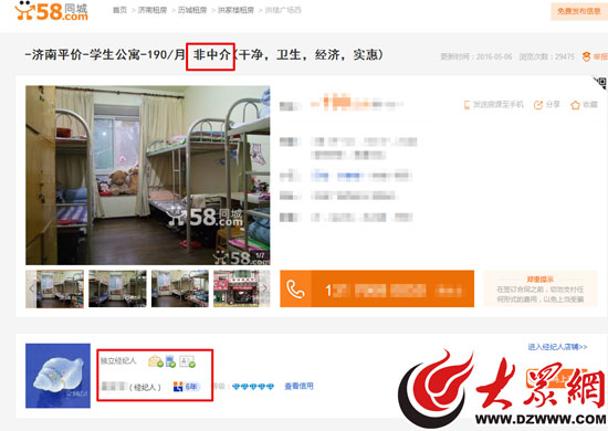 然而記者在調查過程中發現,針對部分租房者“抵觸經紀人”的這一心理,部分經紀人在發布房源信息時,特意在標題中添加了“非中介”等字眼。“(單間出租)非中介歷城****簡單裝修”、“非中介化纖廠路****御華嘉苑”“(單間出租)洪家樓非中介****精裝修全新”等含有“非中介”的標題屢見不鮮,然而打開網頁之后發現房源信息發布者中不乏有獨立經紀人或某房地產認證經紀人。