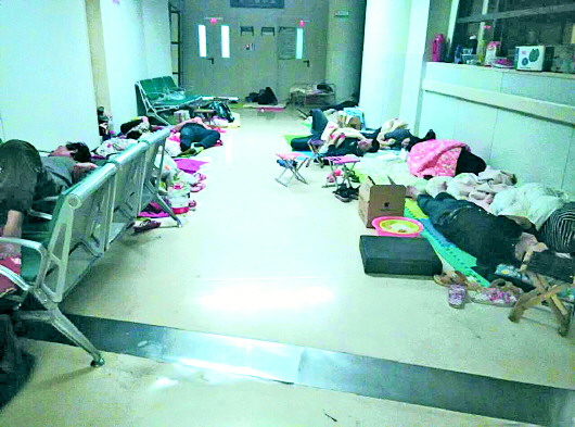 ▲4月16日凌晨3:07,省立醫院東院區的2樓走廊盡頭,陪護的家屬們都已熟睡。窗外飄起了小雨,燈光格外刺眼。