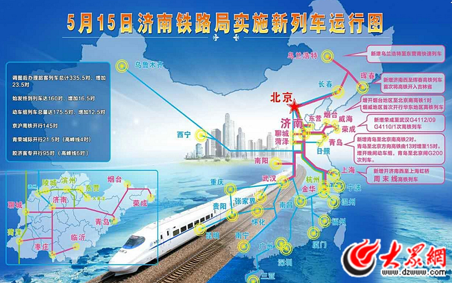 大眾網濟南5月13日訊(記者 王宗陽)5月15日零時起,濟南鐵路局將調整實施新的列車運行圖,這是2007年以來山東鐵路最大范圍的一次調整基本運行圖。新圖實施后,濟南鐵路局辦理旅客列車335.5對,增加23.5對。其中,動車組列車增加明顯,新增12.5對達到175.5對。此次山東鐵路大調圖還有那些亮點?大眾網記者為您一一盤點。