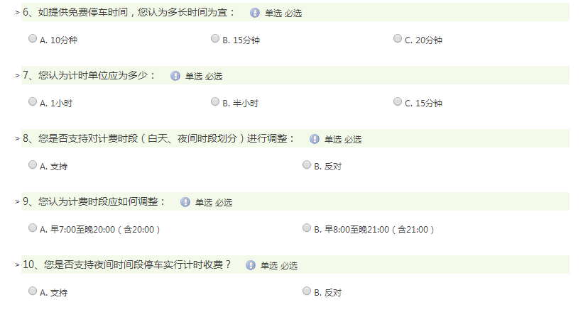 記者發現,在《公開征求意見的有關問題》的調查問卷中,關于市民認為核心區的白天時間段停車收費標準應調整為多少的問題,官方列出了8元/小時、10元/小時和12元/小時三項。關于免費停車的時間該設多長為宜的問題,官方列出了10分種 、15分鐘和20分鐘三個選項。