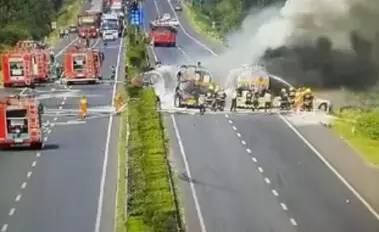 濟青高速北線唐王立交以東約三公里處三輛罐車碰撞后著火,事故目前尚未造成人員傷亡,交警、消防等部門正在進行緊急處置。