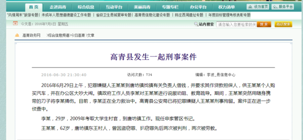 6月29日上午,犯罪嫌疑人王某某到唐坊鎮(zhèn)找鎮(zhèn)有關(guān)負(fù)責(zé)人借錢,并要求其作貸款擔(dān)保人,供王某某個人購買汽車,并在辦公區(qū)大吵大鬧。鎮(zhèn)政府工作人員李某對王某某進(jìn)行說服勸阻、教育疏導(dǎo)。期間,王某某突然用隨身攜帶的刀子將李某捅傷。目前,李某正在全力救治中。高青縣公安局已將犯罪嫌疑人王某某刑事拘留。案件正在進(jìn)一步偵查中。