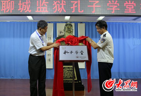 中國孔子基金會副理事長邢成湖(左)、聊城監獄監獄長萬繼烈(右)共同為“孔子學堂”揭牌。