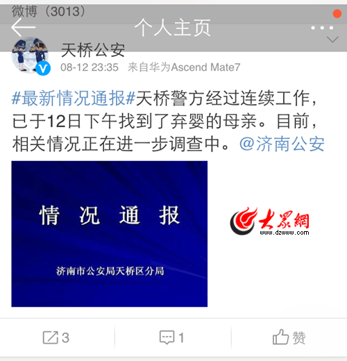 在經過了一天的漫長等待后,今晚23時30分左右,濟南市天橋區公安局再次在其官方微博上發布消息稱,“天橋警方經過連續工作,警方已于12日下午找到了棄嬰的母親。目前,相關情況正在進一步調查中!保大眾網-山東24小時記者 孫杰 樊思思)