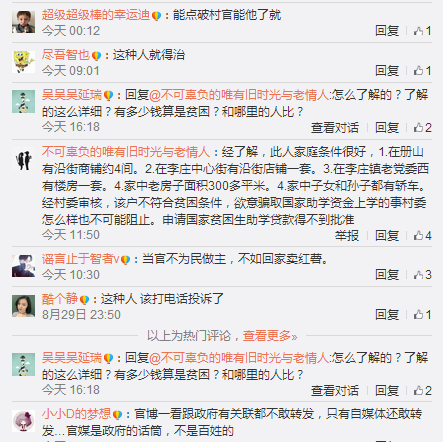 但也有網友在爆料微博下面留言稱,視頻有剪輯,希望大家能夠鑒別真偽。網友“不可辜負的唯有舊時光與老情人”說,經了解,此人家庭條件很好,有沿街商鋪約4間,在李莊中心街有沿街店鋪一套,在李莊鎮老黨委西有樓房一套,家中老房子面積300多平米,家中子女和孫子都有轎車。經村委認真審核,該戶不符合貧困條件。欲意騙取國家助學資金。