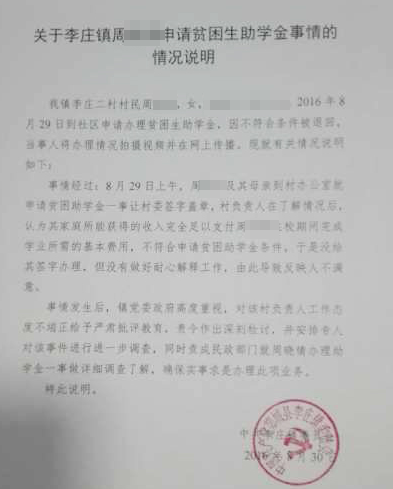 當時李莊鎮李莊二村村民周某某(女)及其母親,到村辦公室就申請辦理貧困生助學金一事,讓村委簽字蓋章,村負責人在了解情況后,認為其家庭所獲得的收入完全足以支付周某某在校期間完成學業所需的基本費用,不符合申請貧困助學金條件,于是沒有給其簽字辦理,但沒有做好耐心解釋工作,由此導致反映人不滿意。