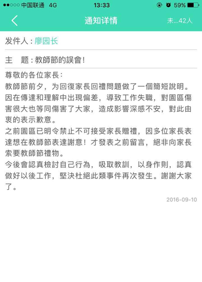 9月8日上午,廖園長在幼兒園APP上發布了接受200元以下禮物的消息