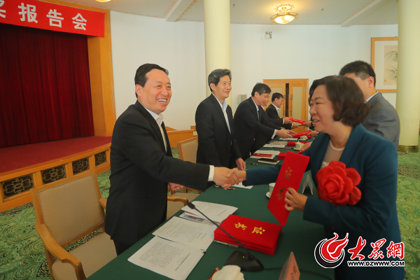 11月11日下午,山東省新聞獎頒獎報告會在濟南召開。在報告會上,山東省委常委、宣傳部部長孫守剛為第26屆中國新聞獎一等獎獲獎者代表大眾網副總編輯李冉頒獎。大眾網記者 王長坤 攝