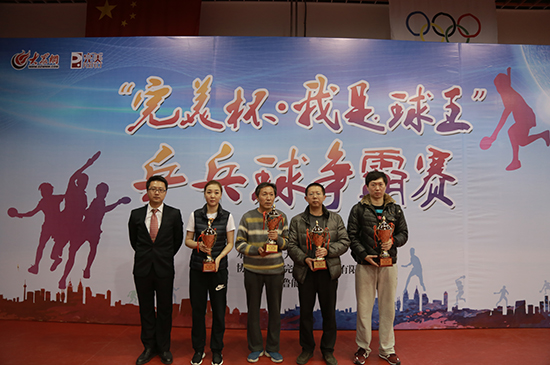 大眾網濟南11月27日訊(記者 劉小芳)今天下午,由山東省互聯網傳媒集團主辦的2016“完美杯·我是球王”乒乓球爭霸賽在山東省體育局訓練中心文東訓練基地落幕。省支付清算協會代表隊奪得冠軍。大眾報業集團監事會主席張軍,大眾報業集團戰略運營部主任、山東文化產權交易所董事長曲濤,山東省互聯網傳媒集團大眾網副總經理陳月軍分別為奪得冠、亞、季軍的單位頒獎。
