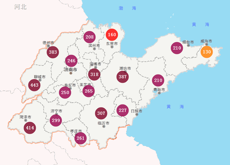 截至19日8:00,全省17市中,德州、聊城、菏澤、淄博、濰坊、臨沂6市達到嚴重污染水平,其中AQI指數最高的是聊城市,為436接近爆表,其次是菏澤市,AQI指數為414;濟南、泰安、萊蕪、濱州、濟寧、棗莊、日照、青島、煙臺9市為重度污染水平,東營為中度污染,威海為輕度污染。