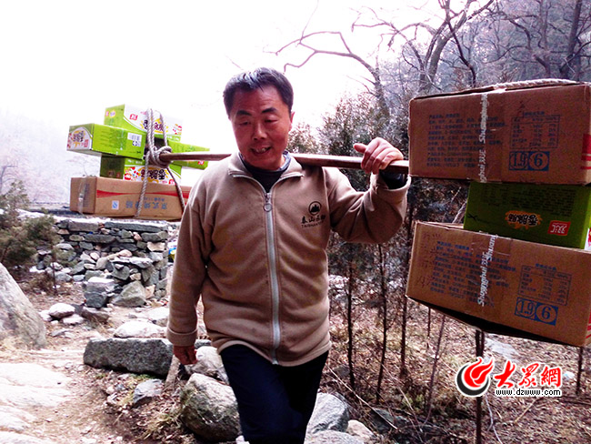 說話間,大眾網記者腳下沒踩實,一下摔倒在山路上。而路宏卻仍然穩穩地挑著貨物,看到記者摔倒,他急忙放下挑著的貨物,扶起記者。“2004年山上下大雪,路特別滑,我也滑倒了。印象特別深刻,因為摔破了鼻子,還怕耽誤了收貨,堅持著把貨送到了地方。”為了避免記者的尷尬,他說起了自己摔倒的事。
