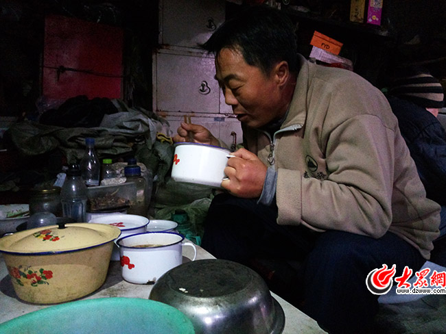 鍋里的清水煮開了,路宏從掛在房梁上的塑料袋里抓了一把面條下到鍋里。大眾網記者抬頭看到,房梁上掛著各種各樣的食物,有饅頭、有煎餅、有一些蔬菜,最多的還是面條。“這都是我和隊友們平時的吃食,怕被老鼠咬就得掛起來。這些食材各人是各人的,做飯也是自己做自己的。”路宏說著,不一會兒晚飯做好了,清湯面加燉白菜,他坐在雜物架起的板子邊大口吃起來。