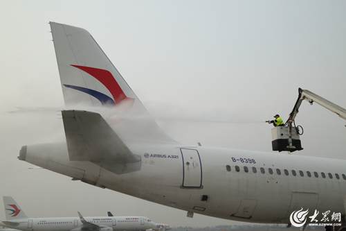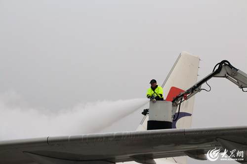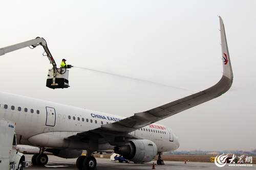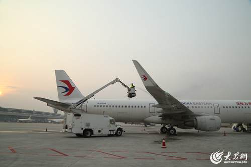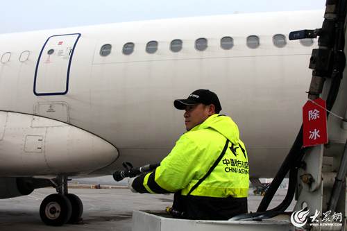1月18日早晨7時(shí)許,氣溫跌破零下4度,青島流亭機(jī)場停機(jī)坪內(nèi),東航機(jī)務(wù)維修人員凌學(xué)偉正操控著移動工作梯,時(shí)上時(shí)下,將噴頭瞄準(zhǔn)一架飛機(jī)的機(jī)翼、機(jī)身除冰霜。