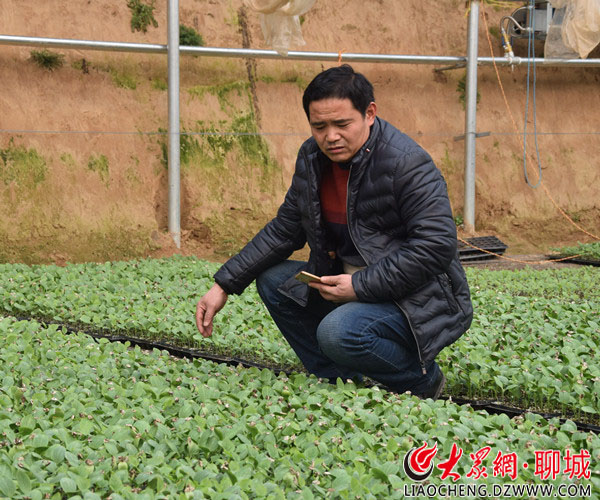 云慶蔬菜種苗合作社的負責人趙彥山正在照看自家的種苗。