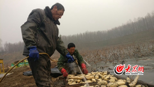 采藕工人從早晨7點開始下水,已經在冰水中呆了近3個小時。徐家行村主任趙劉生告訴大眾網記者:“我們一般每天早晨從7點多開始下水,中午11點半結束,下午1點半再繼續,一直持續到下午天黑之前,每天大概有8個小時的時間待在冰冷的藕池里。眼下正是藕上市的季節,年前這幾天要趕緊采完,不然就賣不出去了。”