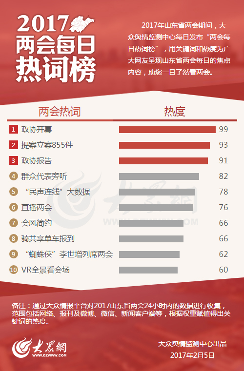 大眾網(wǎng)濟南2月5日訊 今天,山東省政協(xié)十一屆五次會議開幕,大眾輿情監(jiān)測中心發(fā)布的首期熱詞榜中,政協(xié)開幕、提案立案855件、政協(xié)報告,分別以99、93和91的熱度進入熱詞榜前三名。
