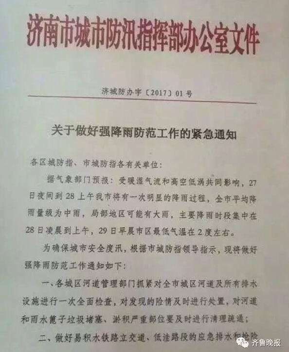 為了應(yīng)對(duì)27日夜間和28日上午的降水,濟(jì)南市城市防汛指揮部辦公室緊急下發(fā)今年01號(hào)文件,要求各防汛部門做好強(qiáng)降雨防范工作。