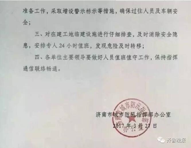 濟(jì)南市還要求對(duì)在建工地臨建設(shè)施進(jìn)行仔細(xì)排查,及時(shí)消除安全隱患,安排人員24小時(shí)值班,發(fā)現(xiàn)危險(xiǎn)及時(shí)轉(zhuǎn)移。