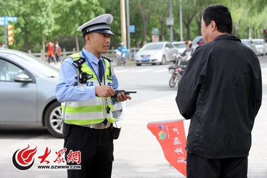 今天濟南泉城路共有20多名行人、非機動車騎車人被罰打小旗維護交通秩序。
