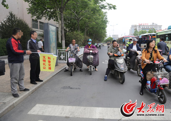 今天上午11點多,大眾網記者來到經十緯一路口,多名交警正在這里開展路口秩序整治行動。11:35左右,一名騎電動車的男子在非機動車道逆行被交警當場攔下。民警遞給這名王姓男子一面印有“文明禮讓 和諧交通”的小黃旗,要求他在路口維持交通秩序20分鐘。