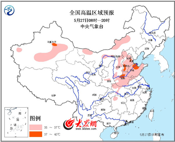 27日11時,山東氣象臺繼續(xù)發(fā)布高溫黃色預警信號:預計今天下午至29日,聊城、德州、濱州、東營、濟南、淄博、濰坊、煙臺和菏澤的最高氣溫35~37℃,其他內(nèi)陸地區(qū)34~35℃,其中28日濱州、東營、淄博、濰坊和煙臺的局部地區(qū)可達38℃。