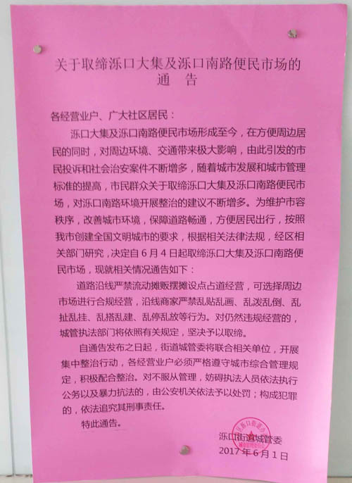 濼口街道辦《關于取締濼口大集及濼口南路便民市場的通告》