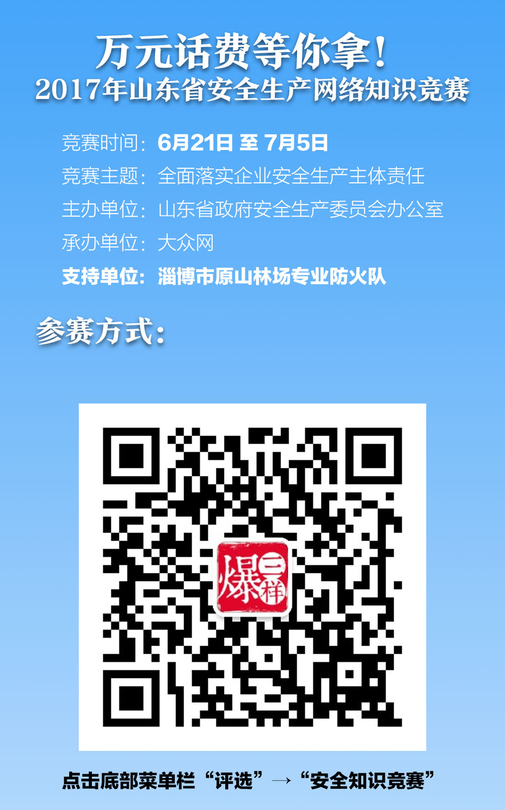 大眾網6月20日訊 2017年山東安全生產網絡知識競賽,攜萬元話費獎金來襲!據了解,該競賽活動是大眾網聯合山東省政府安委會辦公室共同舉辦,將于6月21日啟動,到7月5日結束。競賽采用網上答題方式,社會公眾、干部職工、各級政府安委會成員單位及企事業單位組織等均可參與。大賽設一、二、三等獎和鼓勵獎,共300個獲獎機會、萬余元獎金等你來拿。
