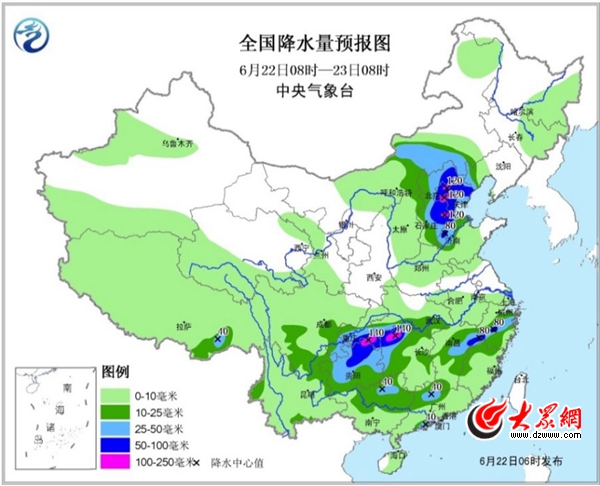 預計,6月22日08時至23日08時,內蒙古中部、河北大部、北京、天津、山東西北部等地的部分地區有大到暴雨,其中北京東北部和南部、天津西北部、河北東南部等地局地有大暴雨(100~120毫米);重慶南部、貴州中北部、湖南西北部、湖北西南部、江西東北部、浙江中部、廣東北部和南部沿海、廣西北部等地有大到暴雨,其中,湖南西北部、貴州東北部、重慶東南部局地有大暴雨(100~140毫米);上述部分地區有短時強降水、局地伴有雷暴大風或冰雹等強對流天氣,最大小時雨強20~50毫米,局地可達60毫米。
