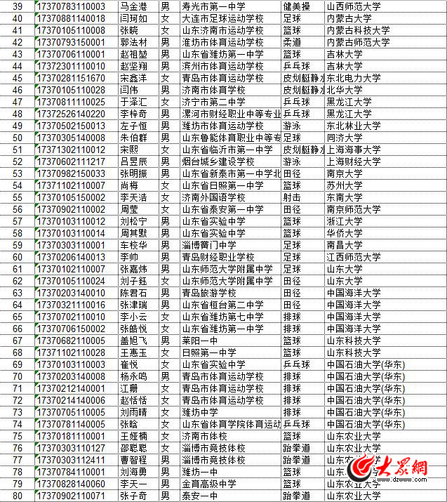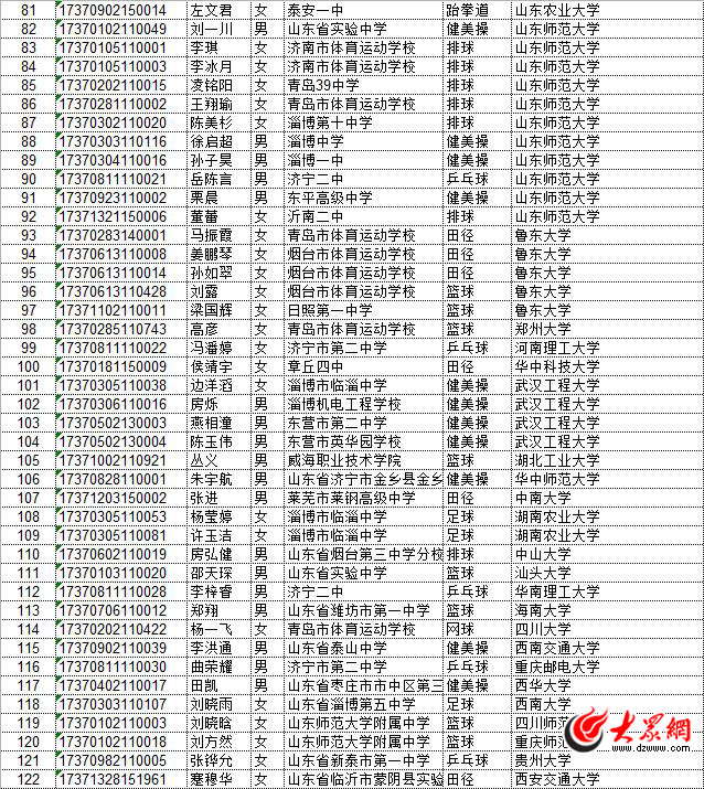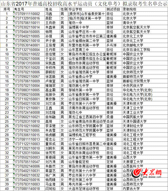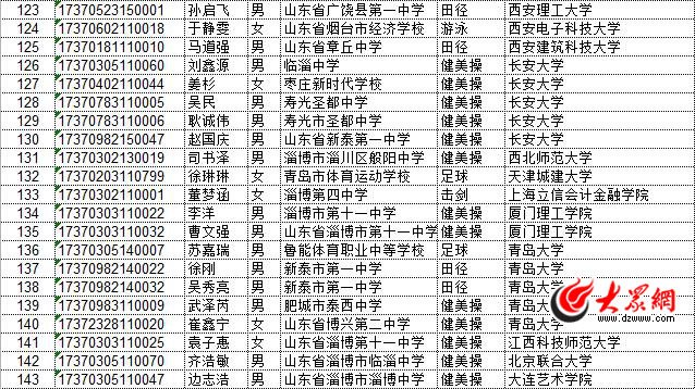 大眾網濟南6月28日訊 記者從山東省教育招生考試院獲悉,山東省2017年普通高校招收高水平運動員(文化單考)擬錄取考生名單日前已公示,共143人,具體如下: