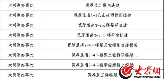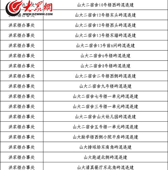 在這次公布的違法建設(shè)拆除臺(tái)賬中,寬厚里有8處板房加樓頂違建上榜;另外,山大洪家樓校區(qū)的31處磚混違建以及南部山區(qū)的數(shù)十處農(nóng)家樂違規(guī)建筑也在這次拆除之列。