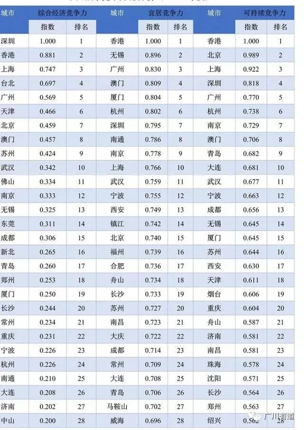 2016年宜居競爭力指數十強:香港、無錫、廣州、澳門、廈門、杭州、深圳、南通、南京、上海。本年度報告的宜居競爭力指標體系更加注重城市在教育、醫療等公共服務以及經濟活力上的表現,與2016年相比,2017年宜居競爭力指數十強城市有明顯變動,廣州、澳門、杭州、南通、南京、上海等城市進入十強榜單。其中,無錫躍居內地城市第一位,比去年提高了八位,尤其在教育環境、醫療環境、經濟環境等方面表現突出。從區域分布看,十強城市依舊集中在長三角和珠三角地區。