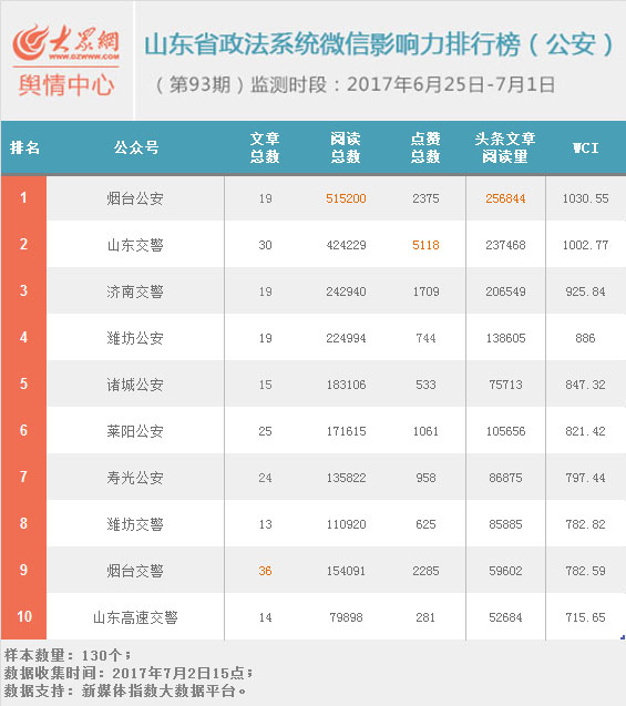 第93期公安機關微信影響力排行榜“煙臺公安”、“山東交警”和“濟南交警”分別獲得冠亞季軍。十強中出現“濰坊公安”和“壽光公安”兩個新面孔,其中“濰坊公安”更是以1篇10w+、4篇1w+的優秀表現進步18個名次。公安榜最受關注的主題有處罰違停車、懸賞通緝、汽車使用知識等。