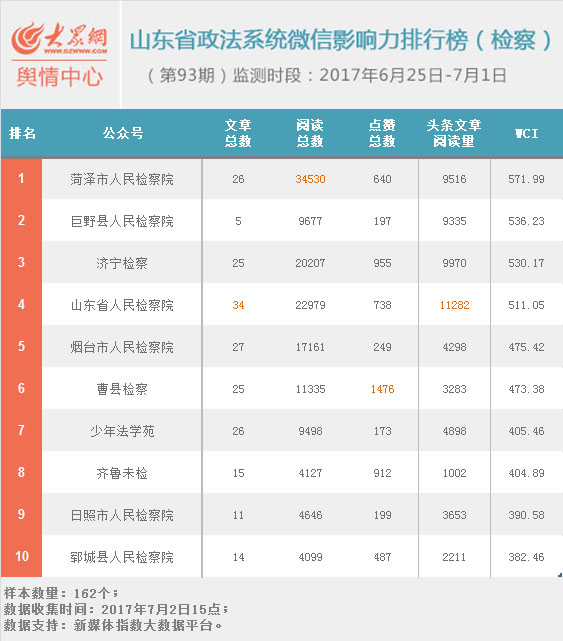 第93期檢察機關微信影響力排行榜“菏澤市人民檢察院”、“巨野縣人民檢察院”和“濟寧檢察”后來者居上,登上三甲寶座。“齊魯未檢”的頭條文章點贊率超50%,閱讀數也有所突破,助其提升17個名次,位列前十。檢察榜最熱門的主題有高考喜報、教師被通報處理、城市宣傳片等。