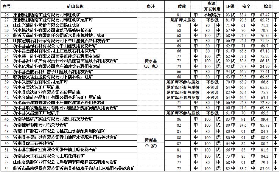 大眾網濟南7月13日訊 13日,經過近乎嚴苛綜合評級,臨沂市安委辦對外公布了第一批180 家非煤礦山企業名單。其中獲得“優評”的企業有21 家,“中評”96 家,“差評”63 家。據大眾網記者了解,此次獲得“差評”的企業,如果整改不到位,將被責令關閉淘汰;而獲得“優評”的企業,則會被列入“發展壯大一批”名單,給予重點扶持。